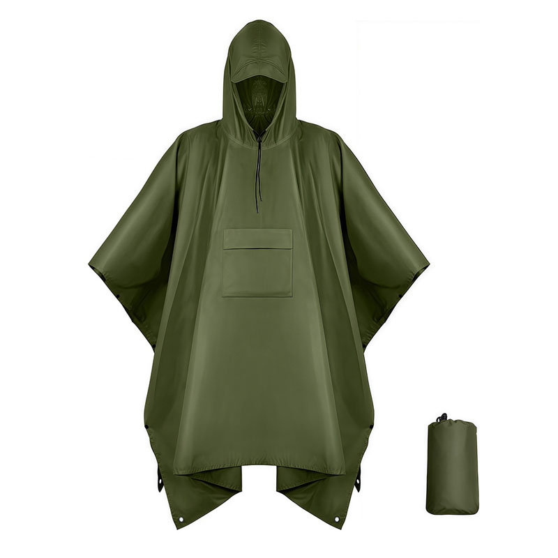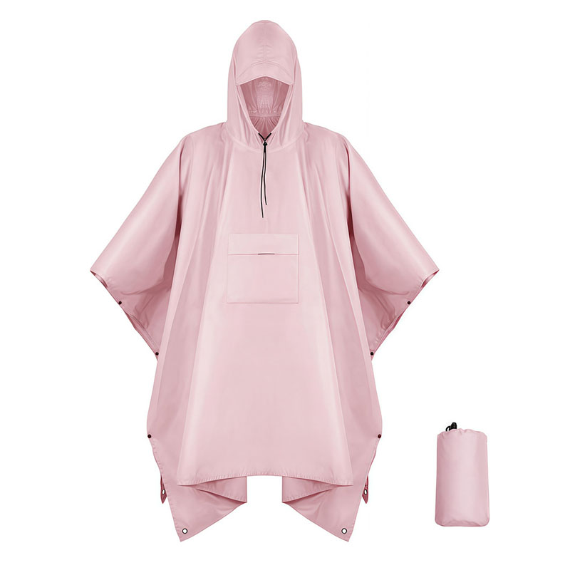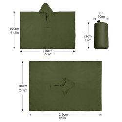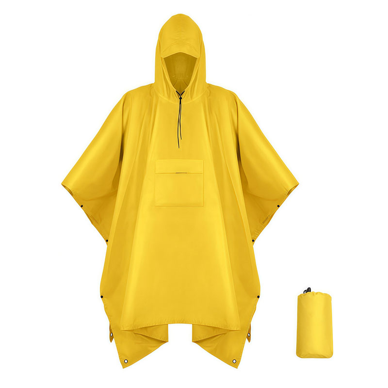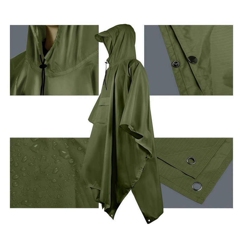 The poncho raincoat is 3" 1 style, not only a raincoat, but also can be used as canopy and picnic mat.This quality raincoat is made of 100% polyester that is not only extremely water proof but also can be recycled and reused for long periods of time. Every time you wear it, you will find it tear resistant, durable, waterproof, quick-drying but still breathable and comfortable.It is ultra-lightweight and easy to be folded in small size into a color matched pouch. It is a good protector for both travel and general purposes.Suitable for riding / cycling / camping / trekking / running / mountaineering and other outdoor activities.